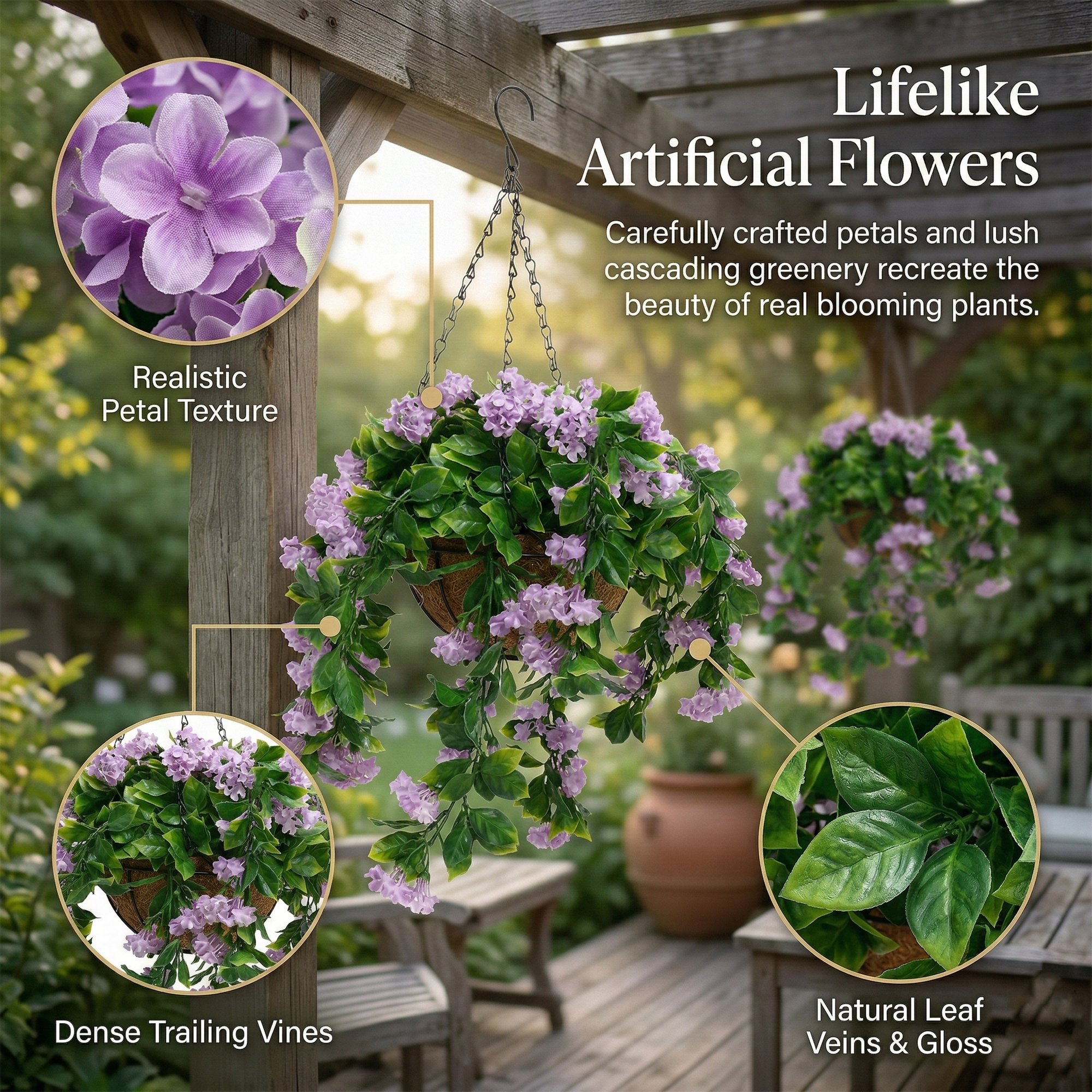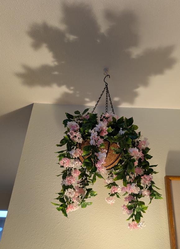 Carefully crafted petals and vibrant greenery recreate the look of real blooming plants, creating a lush and natural hanging display. The cascading vines and full arrangement add instant garden charm to any space.