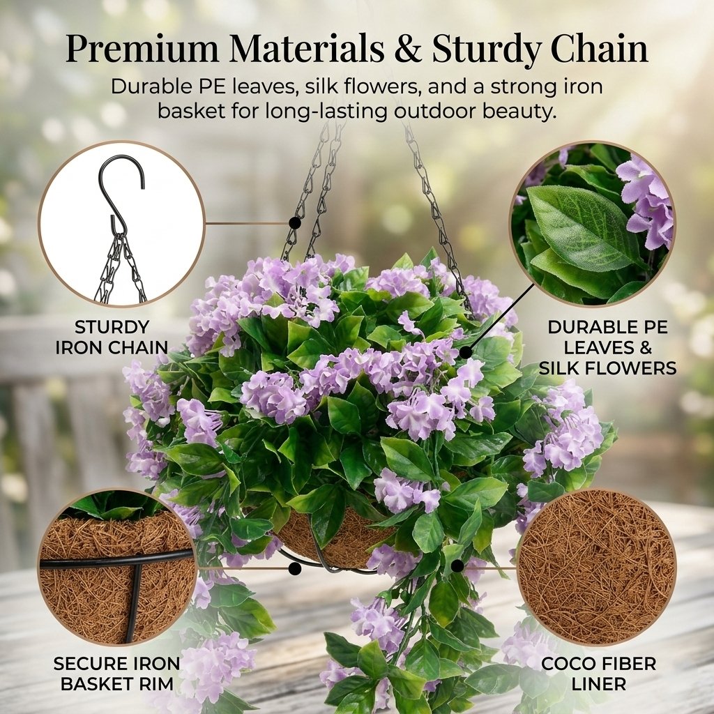 Made from high-quality PE, silk fabric, and durable plastic for a natural appearance and long-lasting use. The strong iron hanging basket and metal chain provide secure support and easy hanging.